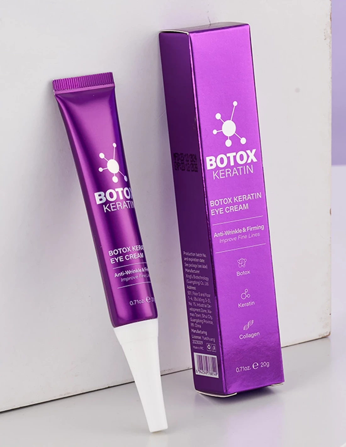 otre crème contour des yeux Botox Keratin associe des actifs reconnus pour prendre soin de la zone délicate du regard. Le collagène hydrolysé aide à préserver une peau visiblement plus souple et plus lisse, tandis que la kératine hydrolysée contribue au confort et à la douceur du contour des yeux. Sa formule est également enrichie en peptides, dont l’Acetyl Hexapeptide-8, pour aider à lisser l’apparence des ridules, ainsi qu’en acide hyaluronique pour hydrater et repulper visuellement la peau. Un véritable cocktail d’actifs pour un regard plus frais, plus lisse et plus reposé.