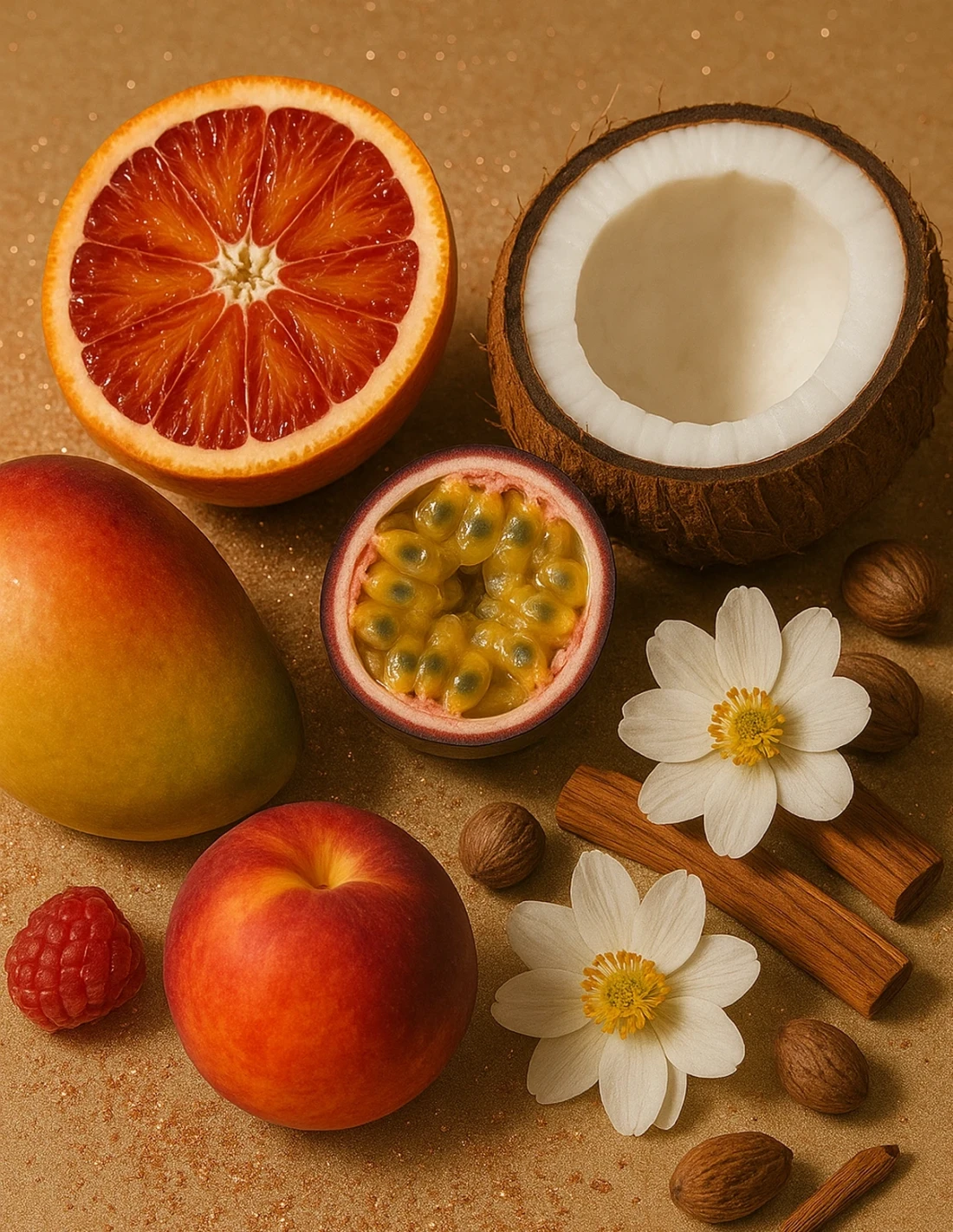 Parfum envoûtant aux notes de mangue, nectarine, fruit de la passion, coco et bois de santal.