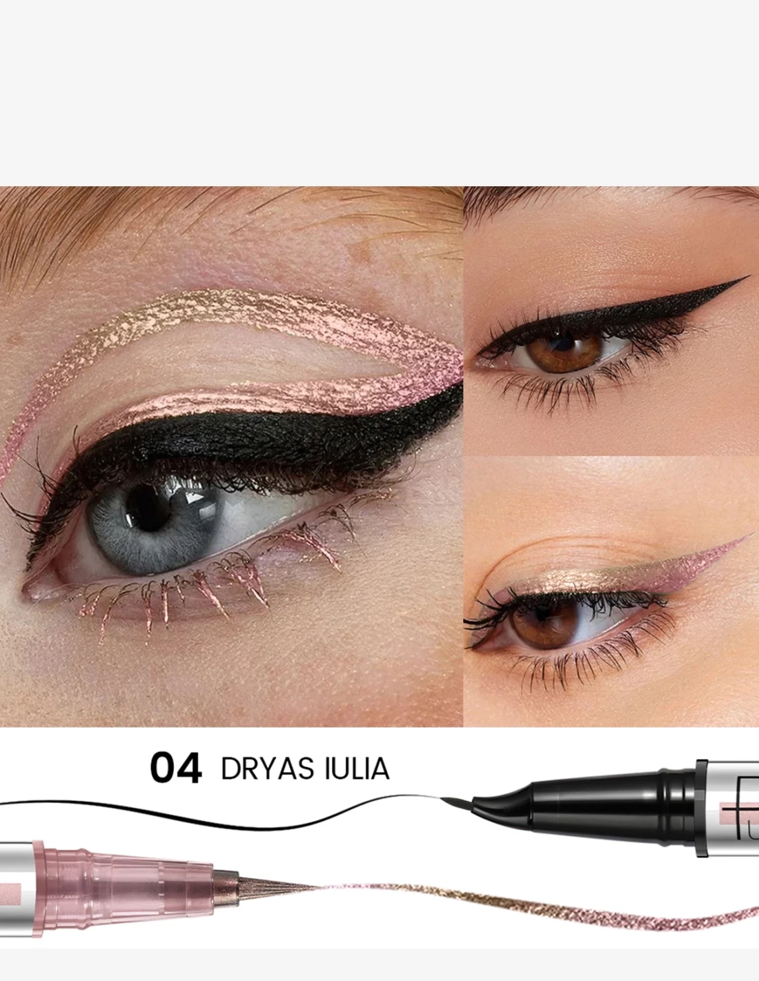 Découvrez l’eye-liner 2-en-1 qui transforme votre regard en un seul geste : un eye-liner feutre noir ultra précis avec pointe 15° pour un trait net, puis un eye-liner multichrome à reflets polarisés pour une touche lumineuse et intense. Sa formule waterproof longue tenue 24H est anti-bavure et ne coule pas, même avec l’eau. Idéal pour un ras de cilsparfait, un cat-eye impeccable ou un double liner tendance. Disponible en 6 couleurs multichromes pour un regard unique, du matin jusqu’au bout de la nuit.