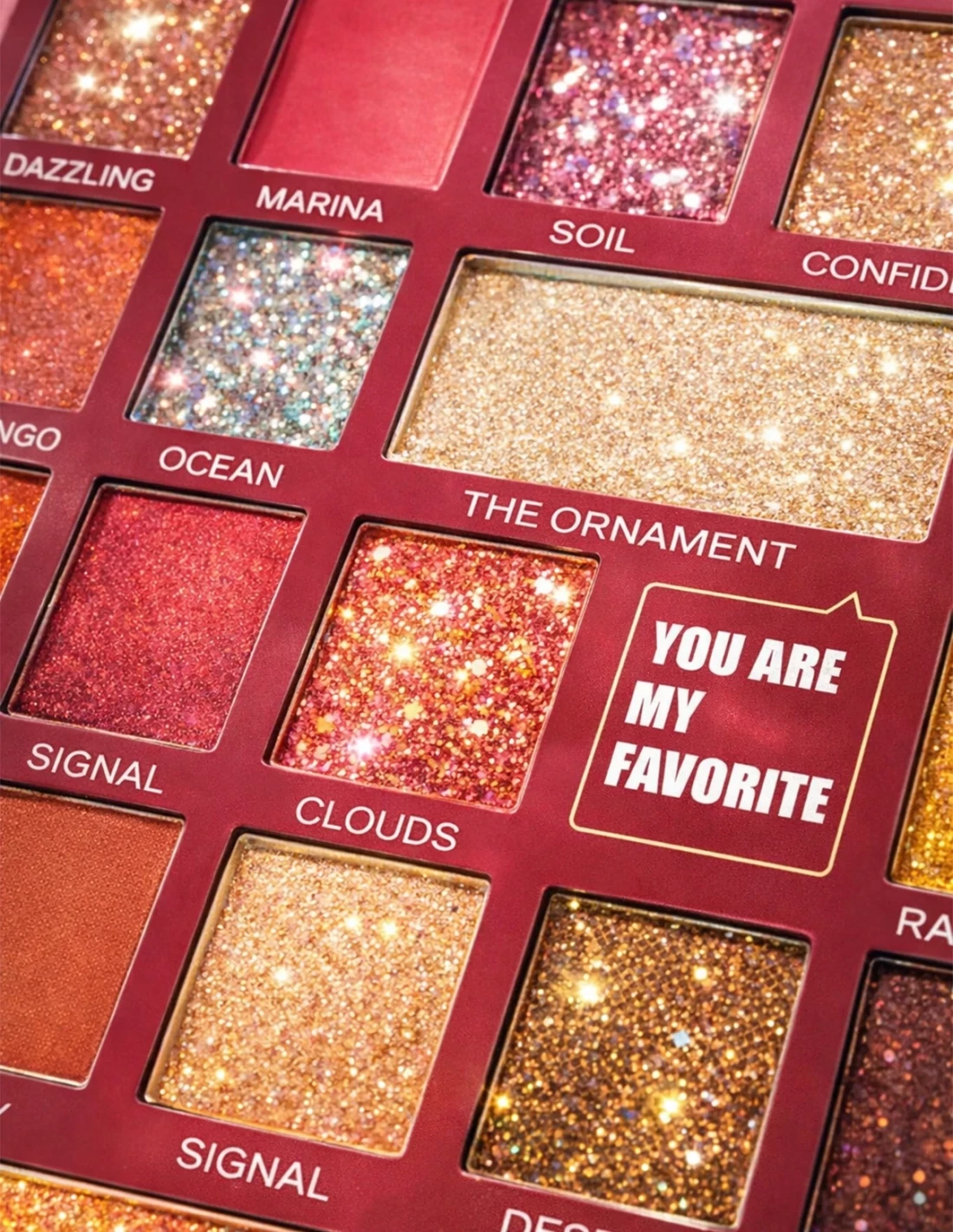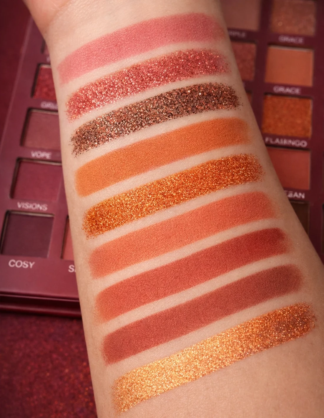Les teintes bordeaux et chaudes apportent de la profondeur au regard, tandis que les nuances nude permettent de travailler des bases douces et élégantes. Les touches pailletées viennent sublimer le maquillage en captant la lumière.