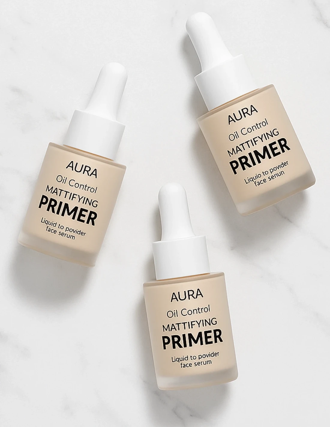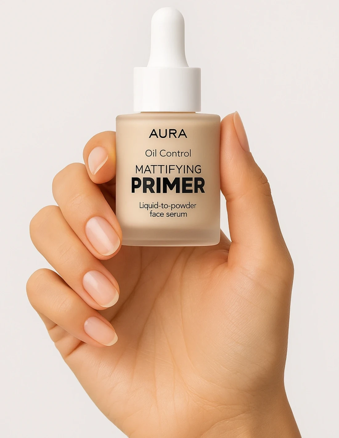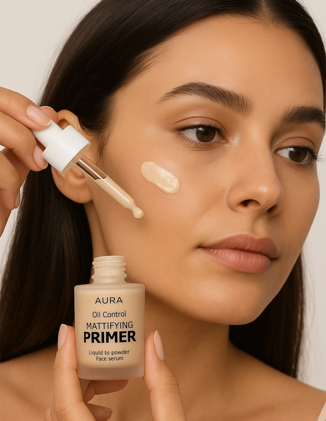 À l’aide de la pipette goutte-à-goutte, appliquez 2 à 3 gouttes du primer matifiant directement sur le dos de votre main ou par petites touches sur le visage (zone T, joues, front).